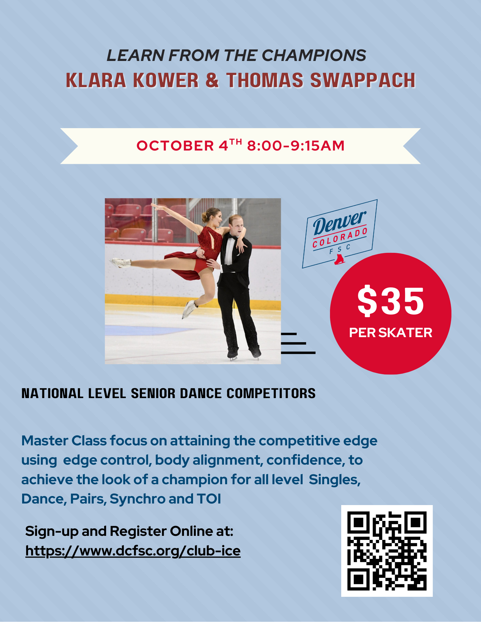The Denver Colorado Figure Skating Club hosts "Club Ice" events throughout the year. These are sometimes clinics, master classes with guest coaches, skate swaps or holiday parties. See below or look for Club Ice events in our club newsletter and social media sites.